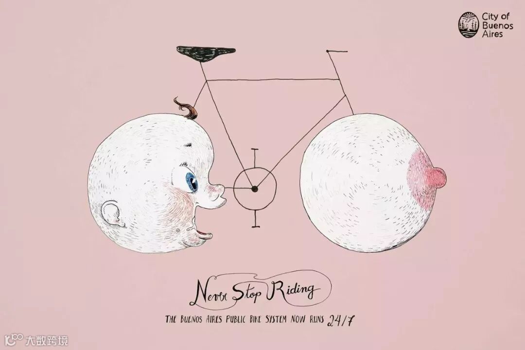 广告主体部分由孩子和奶水、狗狗和尾巴、松树和坚果、飞蛾与灯泡,底部广告文案是“Never Stop Riding“-”The Buenos Aires Public Bike System Now runs 24/7“文案翻译过来就是“永不停止骑行-布宜诺斯艾利斯爱丽丝公共自行车系统现在一周7天24小时不间断服务”,广告要传达的就是,就像孩子和奶水、狗狗和尾巴,他们永远不会停止追着。