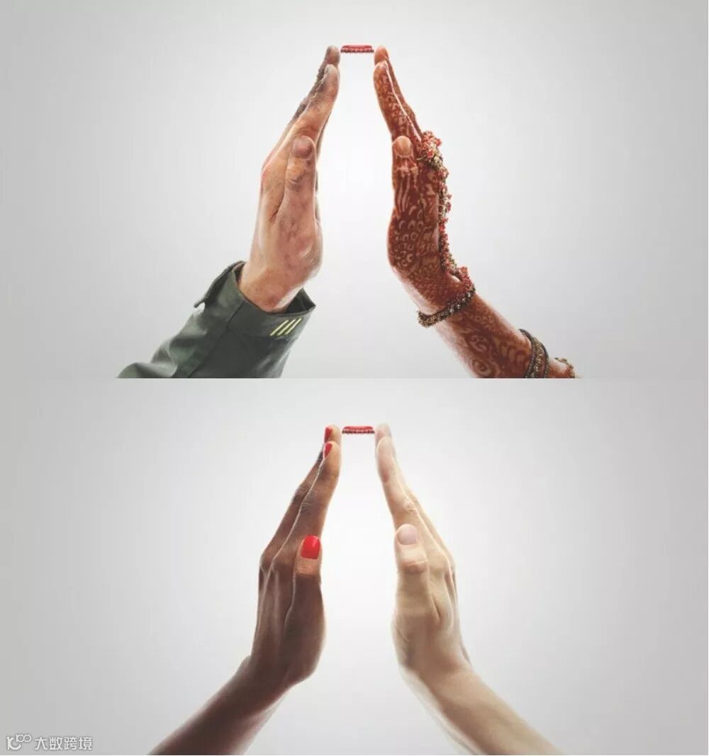 广告中的两只手分别代表“爱”或者“和平”,利用由此结合成为一瓶可口可乐的形状分别表示——为了和平/爱,一起可口可乐!