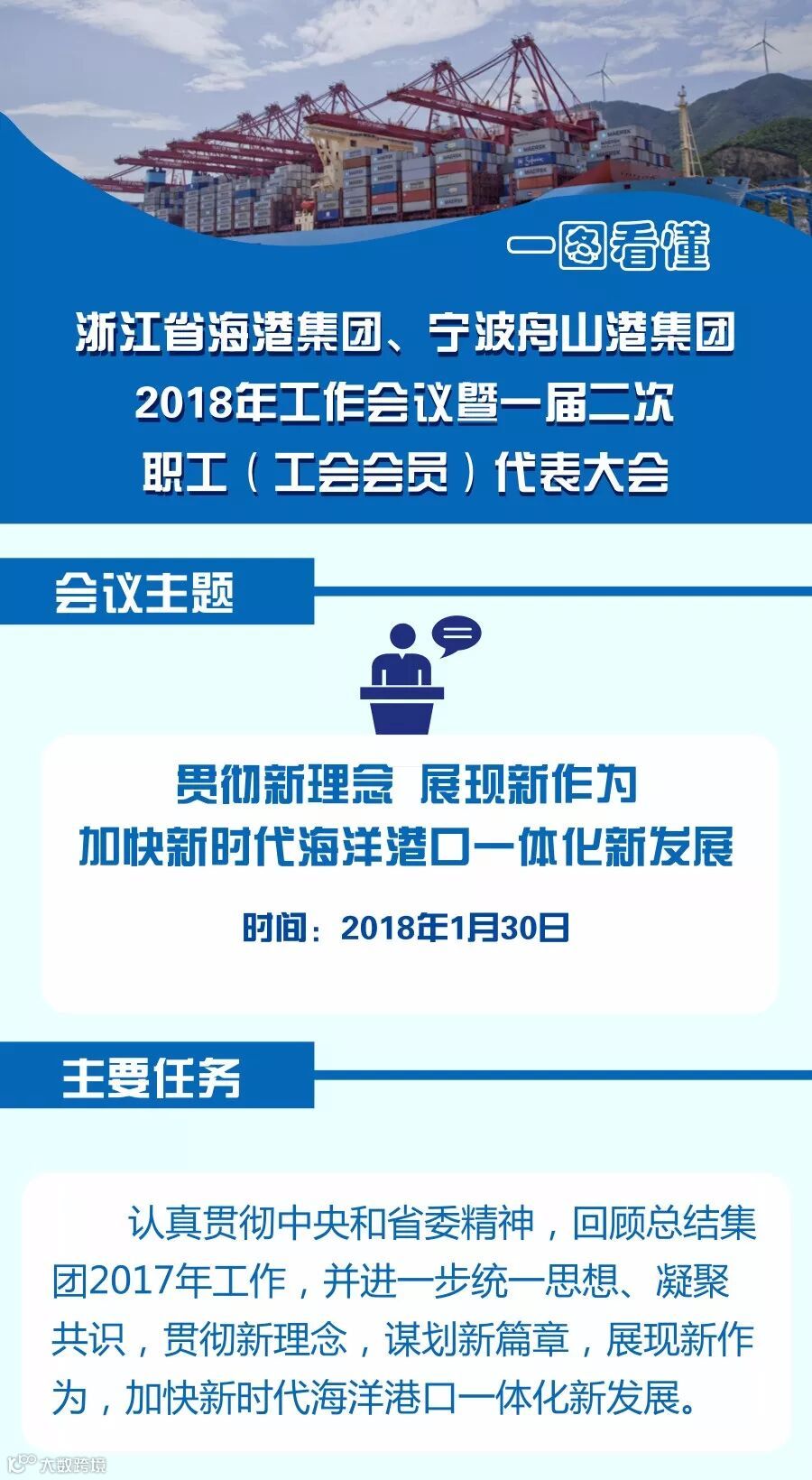 2017年,咱们干得咋样?2018年,集团准备如何干?小编为大家带来一图看懂浙江省海港集团、宁波舟山港集团2018年工作会议暨一届二次职工(工会会员)代表大会。
