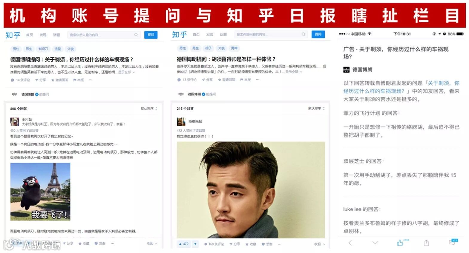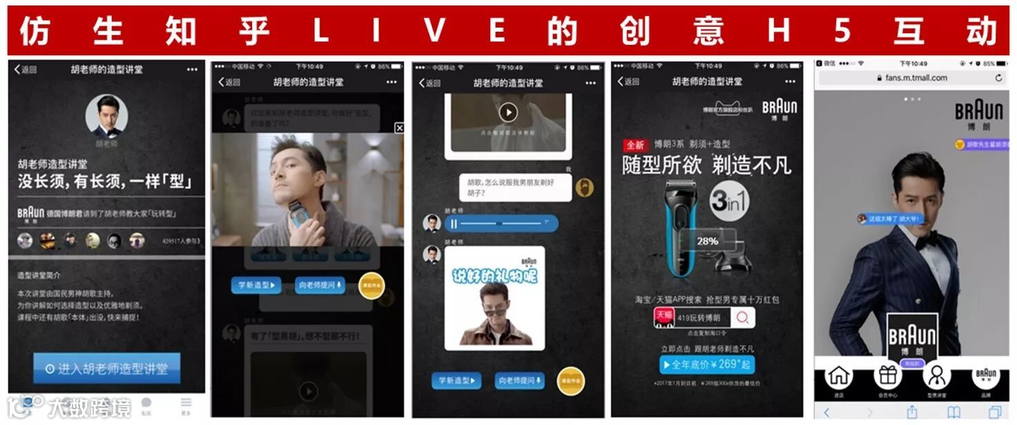 恰逢博朗签约当红明星胡歌为品牌代言人,致趣为品牌策划了一场「假的」知乎 Live,男神胡歌变身颜值提升导师,通过亲身拍摄的型男剃须视频教程和音频等丰富形式,与新晋白领们充分互动,传授如何通过剃地一手帅胡须来提升颜值实力。在这则创意 H5 上线前后,博朗发起两个趣味提问,向知友征集他们曾经历的「剃须车祸现场」和跟男神学剃须后的「帅气胡须造型」,引发知友的共鸣与积极互动;精彩的回答内容更被辑选至知乎日报的瞎扯栏目,形成二次扩散。