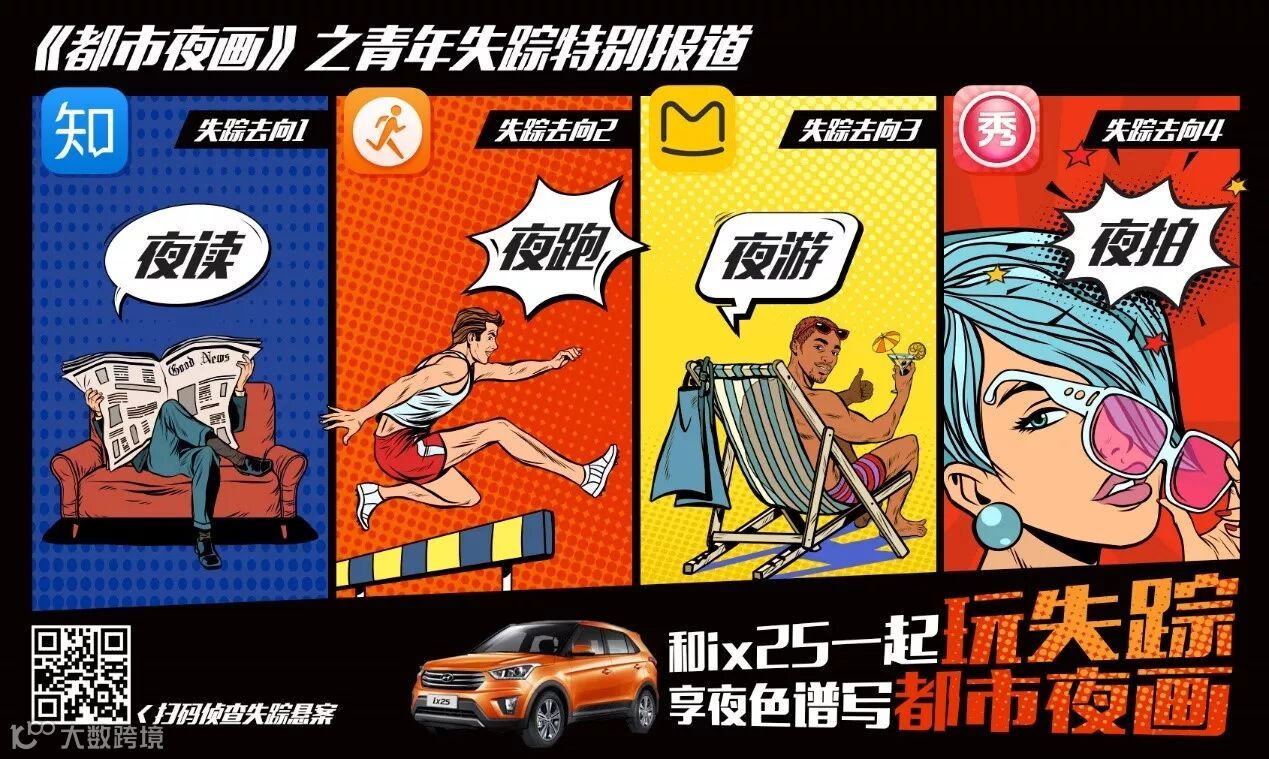 基于此,致趣帮助品牌联手知乎、乐动力、蚂蜂窝、美图秀秀四大年轻人喜爱的媒体,策划了一场都市青年深夜失踪事件:首先以悬疑故事和创意 H5 的形式吸引年轻人勘破悬案,了解「失踪」真谛,并整合性预告四大媒体活动;紧接着,在四大媒体平台活动陆续上线, 发布夜读、夜跑、夜游、夜拍的失踪号令。