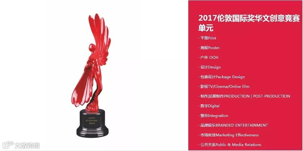 2017年,伦敦国际广告奖首次为华文市场开辟了新奖项:华文创意竞赛单元,这也是全球首个不再需要把作品翻译成英文才能参赛的顶级国际奖,旨在评选出真正代表全球最高水准的华文创意作品。