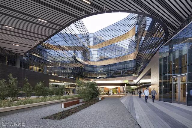 位于加州圣何塞的三星总部大楼同样出自 NBBJ,如同任何一个靠汽车驱动的城市一样,这里缺乏可以步行的公共空间。NBBJ 在建筑里设计了真的能供人们行走的通道,内部庭院可以供人们驻足、休憩。不同于三星这个素来以等级森严闻名的企业,Eric 强调,这是三星在设计始初就明确表达的需求——创造一个这座城市缺乏的公共空间。一幢 10 层的塔楼如同三明治结构,除了底层的中央庭院,建筑中间有步道。中央庭院内的运动场、艺术区和咖啡店都将部分对外开放。