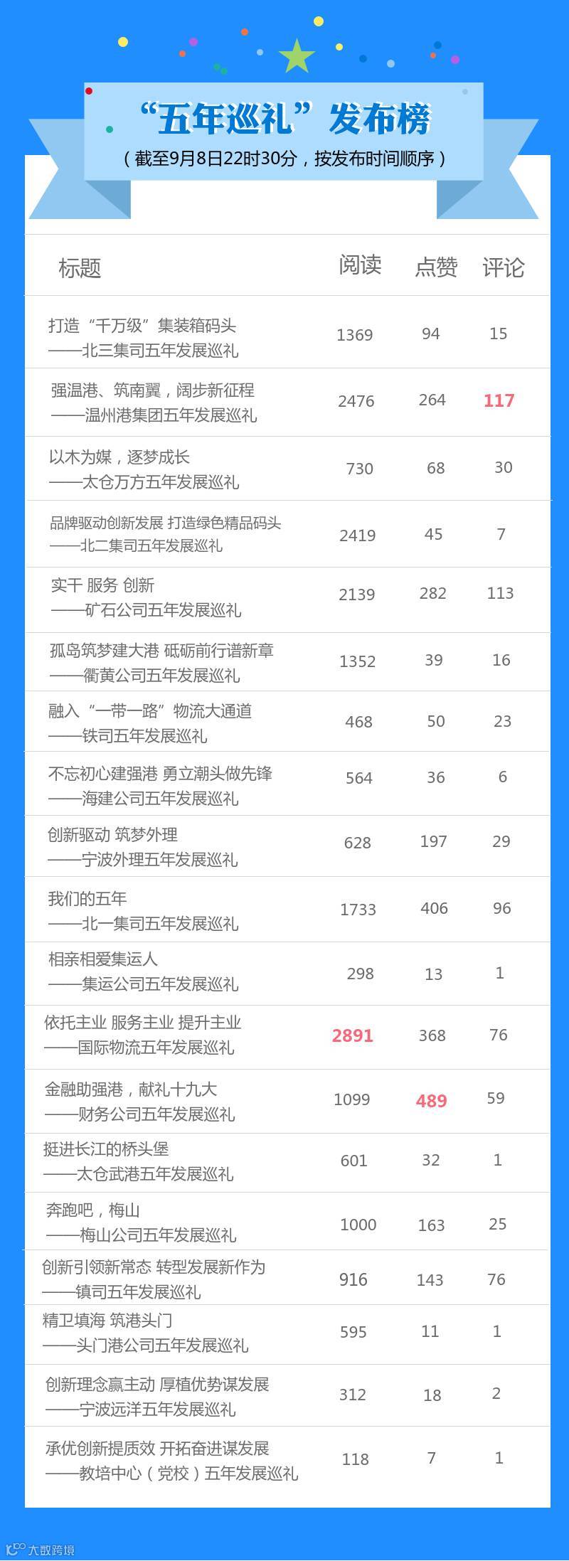 “五年新业绩 献礼十九大”微信专栏连续推出四周了!让我们一起来看看榜单上多了哪些新面孔?哪些单位的热度在持续攀升?