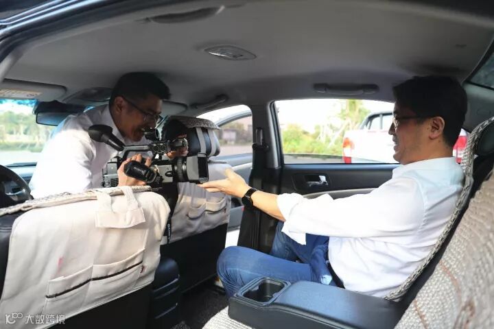 在拍摄班车行进过程中的对话素材时,镜头要随着对话人物变化来回切换,车内空间狭小,既要固定机位,又要来回切换,副驾驶座的一大半位置给了机位,我们两个人只能挤在剩下的位置上,为了避免摄像机抖动,我们还“抱”在了一起。其中一个人一条腿半跪在座位上,另一条腿顶着前挡风玻璃。这段短短一分钟的镜头素材拍摄足足用了14分钟,拍完我们大汗淋漓。