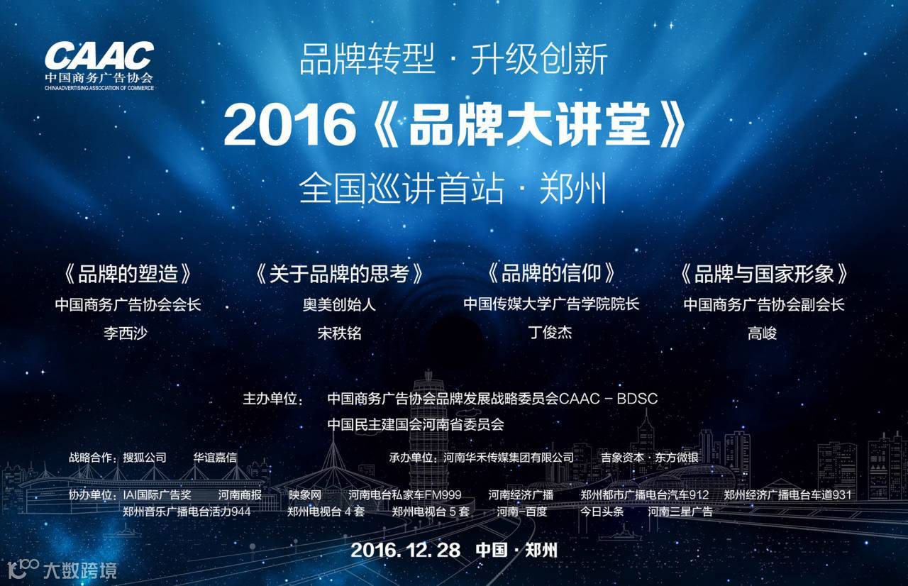 2016《品牌大讲堂》于去年12月28日在郑州召开,上届《品牌大讲堂》以“品牌转型•创新升级”为主题,中国商务广告协会会长李西沙、中国商务广告协会副会长宋秩铭、高峻、丁俊杰受邀参会并发表演讲。