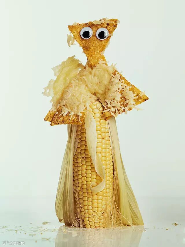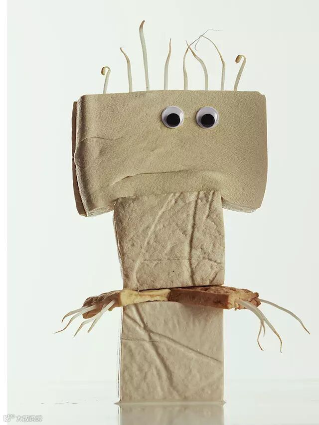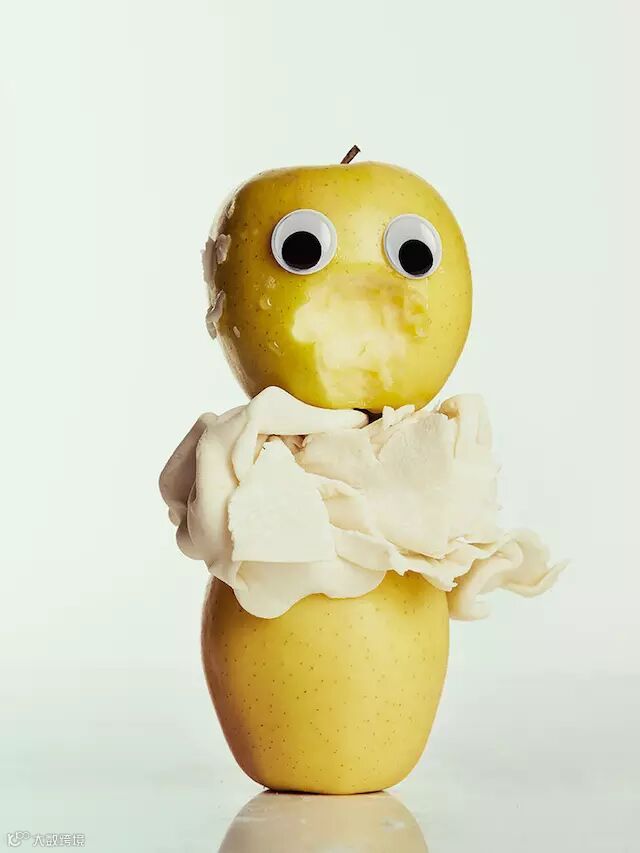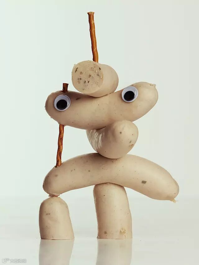 比如玻璃瓶和葡萄的组合,苹果和面饼的组合,玉米、糕点以及磨碎的奶酪的混搭,或者是将未煮熟的香肠以搭积木的方式拼接,以及豆腐、豆芽以及豆干等豆制品的全家福造型等等。而那个看起来“愚蠢”的塑料眼睛,才是画龙点睛的关键一笔,正是因为有了这个塑料眼睛,这些作品才有了生命、表情和情绪,赋予了其人格化的魅力。