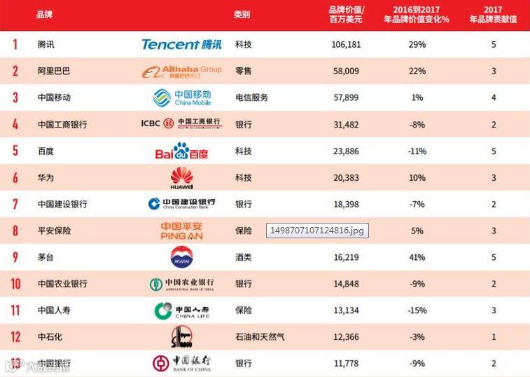 DoNews 6月29日消息:2017年的BrandZ世界百强品牌排行榜上,科技公司依然占据主导地位,谷歌、苹果和微软连续三年霸占前三。中国企业共计有13家企业入围,腾讯更是闯入前十,排名第八。