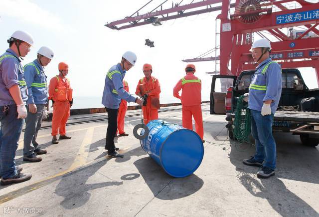 “目标位置确定,执行下一步打捞方案。”8月3日,北二集司联合油港轮驳分公司“甬港拖27”轮组织开展模拟集装箱坠海事故现场处置演练,图一的工作人员正拿着一个大磁铁在模拟锁定“集装箱”(大油桶)的坠海位置。