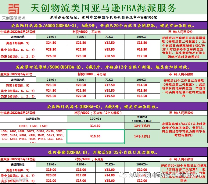 注:USFBA-G 更改为美森正班船限时达材积/5000渠道!!