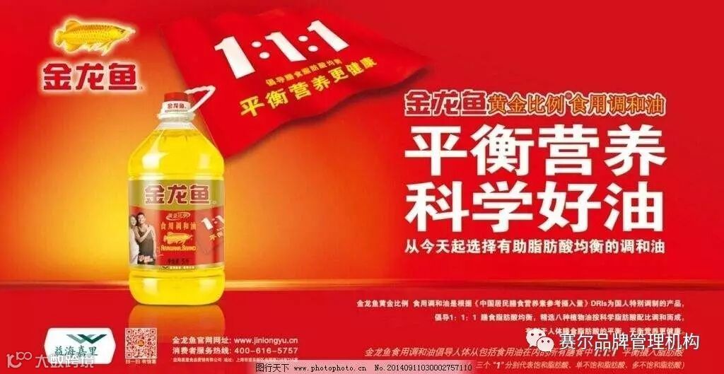 2002年,“金龙鱼”又一次跳跃龙门,获得了新的突破,关键在于其新的营销传播概念“1∶1∶1”。看似简单的“1∶1∶1”概念,配合“1∶1∶1”最佳营养配方”的理性诉求,既形象地传达出金龙鱼由三种油调和而成的特点,又让消费者“误以为”只有“1∶1∶1”的金龙鱼才是最好的食用油。