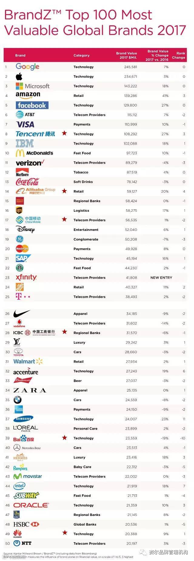 作为全球最大、最权威的品牌建设平台,BrandZ 研究对象是那些已经融入消费者日常生活之中的品牌。这项品牌估值研究采用了业内独有的调查方法,将全球 300 多万消费者的访谈结果与各家公司财务和经营业绩分析相结合。BrandZ 的排名研究机制综合考虑品牌的财务表现(根据凯度消费者指数和彭博的数据)以及根据消费者研究获得的品牌贡献值(Brand contribution index)。