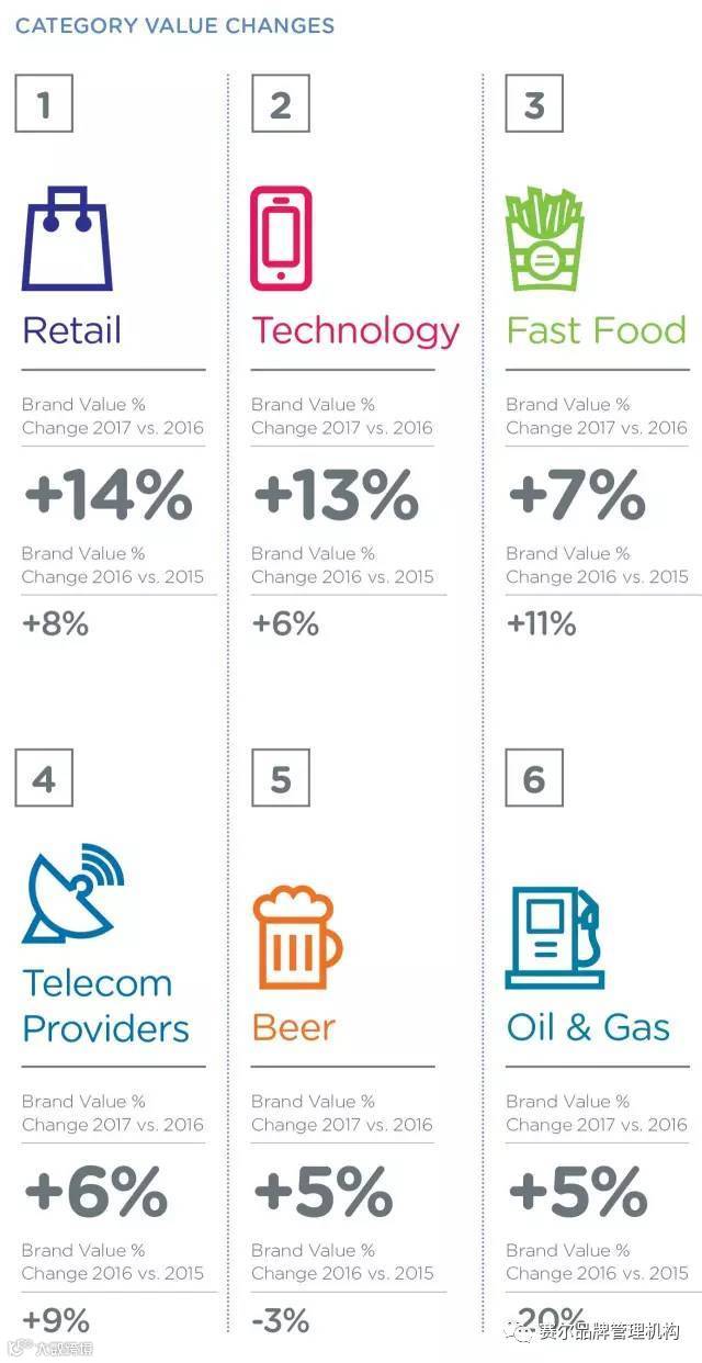 零售业是价值增长最快的品牌类别,在过去 12 个月中价值增长了 14%。亚马逊和阿里巴巴等电子商务品牌与许多本地互联网公司一样,继续加强实体店销售渠道,推动零售业的增长。总体而言,纯在线零售商的价值自 2006 年以来增长了 388%,而传统零售商由于需要更多时间来新增在线购买渠道,因此价值下降了 23%。 技术类品牌价值增长了 13%,快餐业今年的价值增长率排名第三(增长了 7%),因为其主要品牌推出了生鲜食品和超值菜单,并对客户接触点进行了创新,提升了品牌体验。