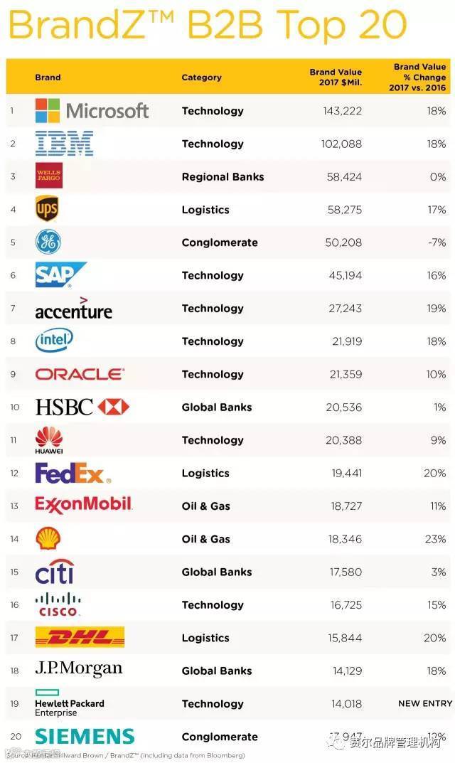 B2B 品牌前 20 名的价值上涨了 11%。其中,微软继续保持排名第一,价值增长了 10%,达到 1432 亿美元。壳牌是增长最快的 B2B 企业,价值增长了 23%,达到 183 亿美元。排名还表明,数字世界使得企业环境与消费者环境之间日渐重叠,B2B 和 B2C 之间的界限正在逐渐消失,由此催生了 B2H(企业对人类)这一新品牌类型。