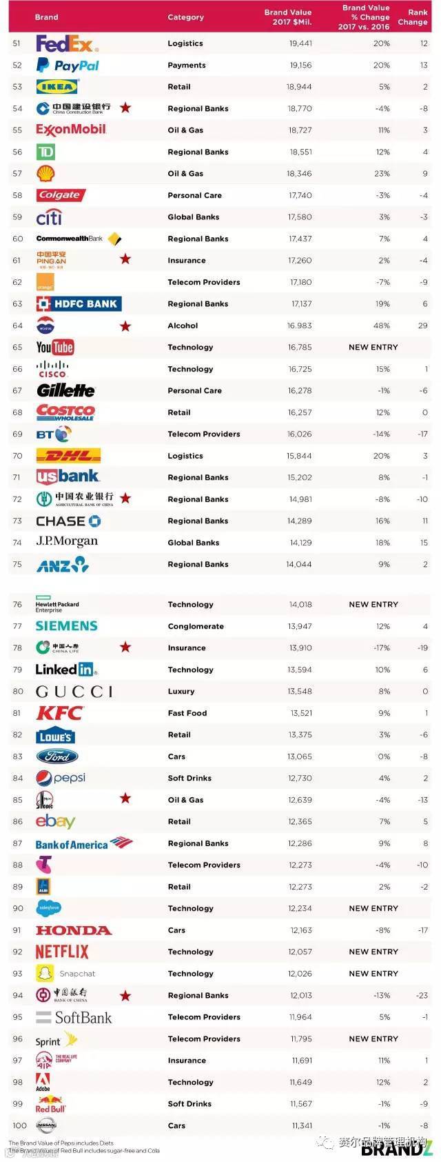 今年中国品牌上榜数量比去年减少了两家:中国石油(去年 83 名)和去年新上榜的京东(去年 99 名)都未能进入今年的前 100 名。今年众多国有企业的表现不甚理想,但除了国有企业以外的中国品牌总价值上涨了 11%。