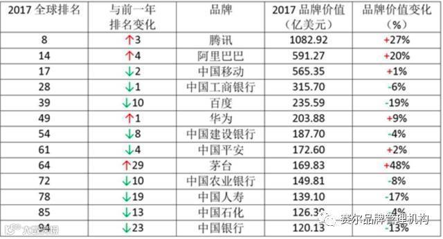 今年在排行榜上共有 13 个中国品牌。排名第一的是腾讯(排名第八),其社交平台微信的用户量持续上升,达到 1083 亿美元,排名首次进入前十。值得注意的是腾讯本次品牌价值增长了 27%,较去年的 11% 进一步加速。按品牌价值的百分比增长计算,阿迪达斯上升速度最快,增长了 58%,不过阿迪达斯没有进入前 100 名。中国茅台是全球统计范围内增长第二快的品牌,增长了 48%。