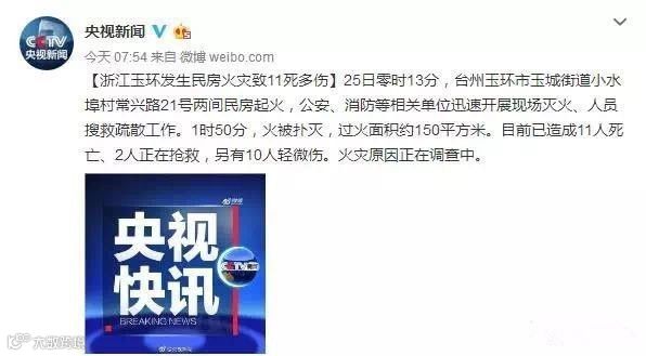 2017年9月25日零时13分,台州玉环市玉城街道小水埠村常兴路21号两间民房起火,公安、消防等相关单位迅速开展现场灭火、人员搜救疏散工作。1时50分,火被扑灭,过火面积约150平方米。目前已造成11人死亡、2人正在抢救,另有10人轻微伤。火灾原因正在调查中。