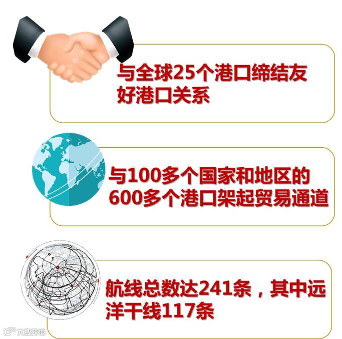 与此同时,集团与马士基、地中海等大型航运公司,迪拜环球等大型港口集团加强合作,助力宁波舟山港成为远东地区乃至全球重要的枢纽港。截至目前,宁波舟山港共与全球25个港口缔结友好港口关系,与100多个国家和地区的600多个港口架起贸易通道,航线总数达241条,其中远洋干线117条,勾勒出港通天下的航线网络。