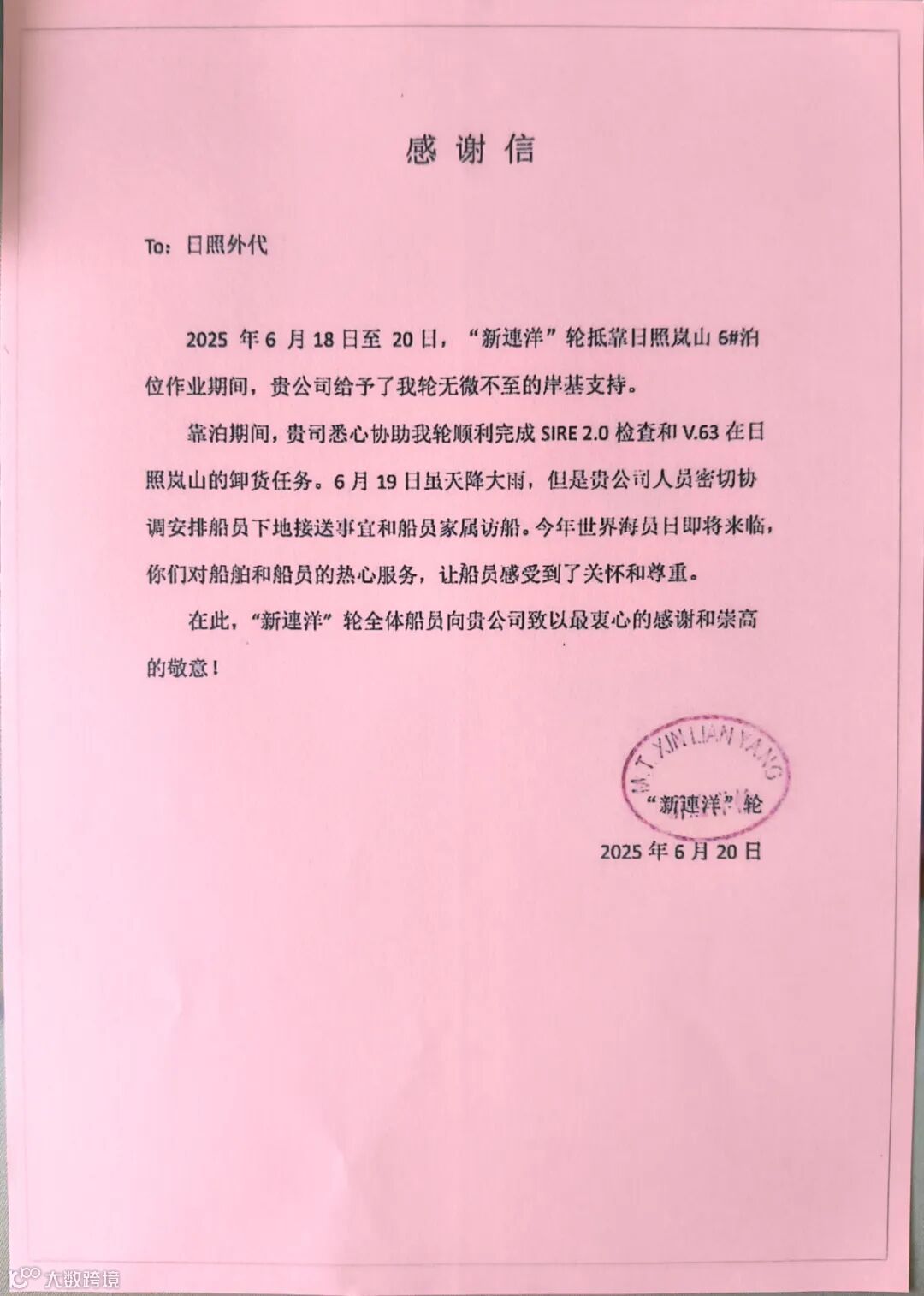 近日,日照外代收到集团所属超级油轮“新连洋”轮的感谢信。信中,“新连洋”轮对日照外代在船舶卸货和靠离泊安排、SIRE2.0检查、船员家属访船及船员下地就医等全流程服务中展现出的专业素养与人文关怀表达了诚挚谢意。
