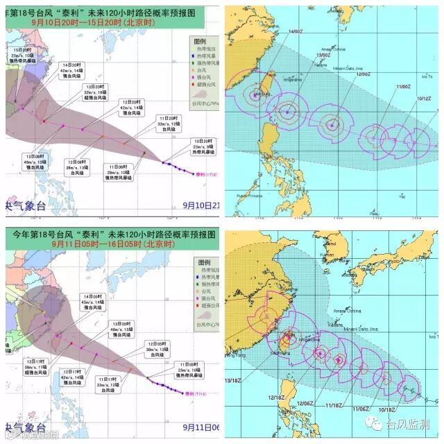 ▲中央气象台9月10日15时(左上)和11日05时(左下)发布的“泰利”路径概率预报图和美国联合台风警报中心9月9日08时(右上)和11日02时发布的“泰利”后期路径概率图。