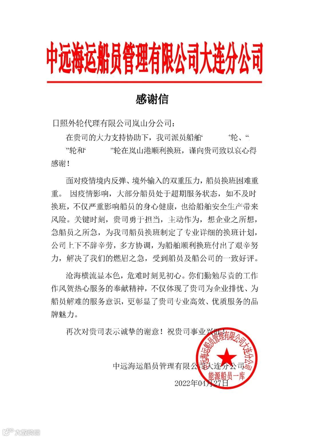 日照外代贯彻落实总部“以客户为中心”的服务理念,在青岛大区的引领下,将客户需求放在首位,积极应对困难挑战,全心全意为客户排忧解难,努力在落实保 “五稳”目标上下功夫。近日,日照外代攻坚克难,在相关主管单位的帮助下,在一周的时间内连续为集团内兄弟单位中远海运能源运输股份有限公司(以下简称中远海能)下属的3条超级油轮,共计123人次,完成船员换班,收到兄弟单位的感谢信。