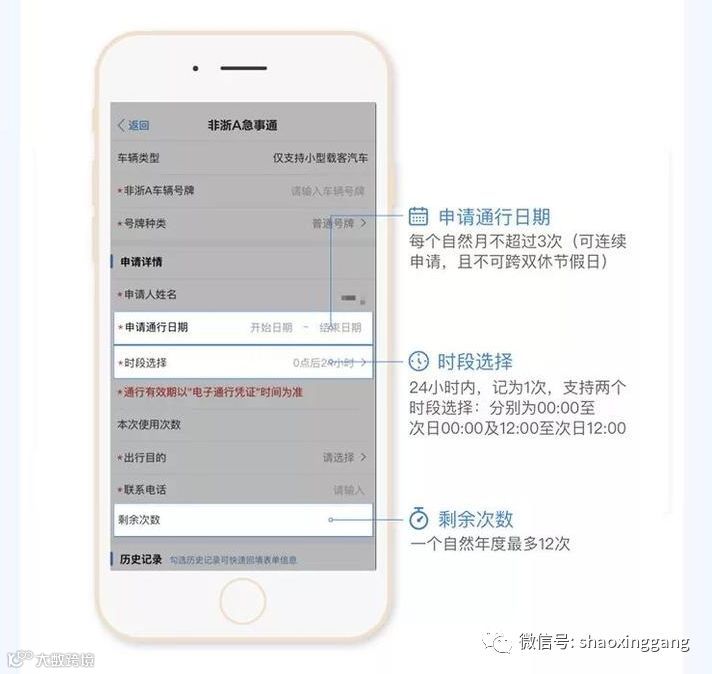 每辆非浙A号牌的小型客车在一个自然年度内最多允许通行12次(2019年为6次),每个自然月不超过3次。其中,24小时内(相邻的两个限行时段)在“错峰限行”区域内通行的,计为1次。如果申请日后一天为双休节假日,不可跨越。如仅申请周五晚高峰的,有效期不可顺延至下一工作日并视为使用一次。