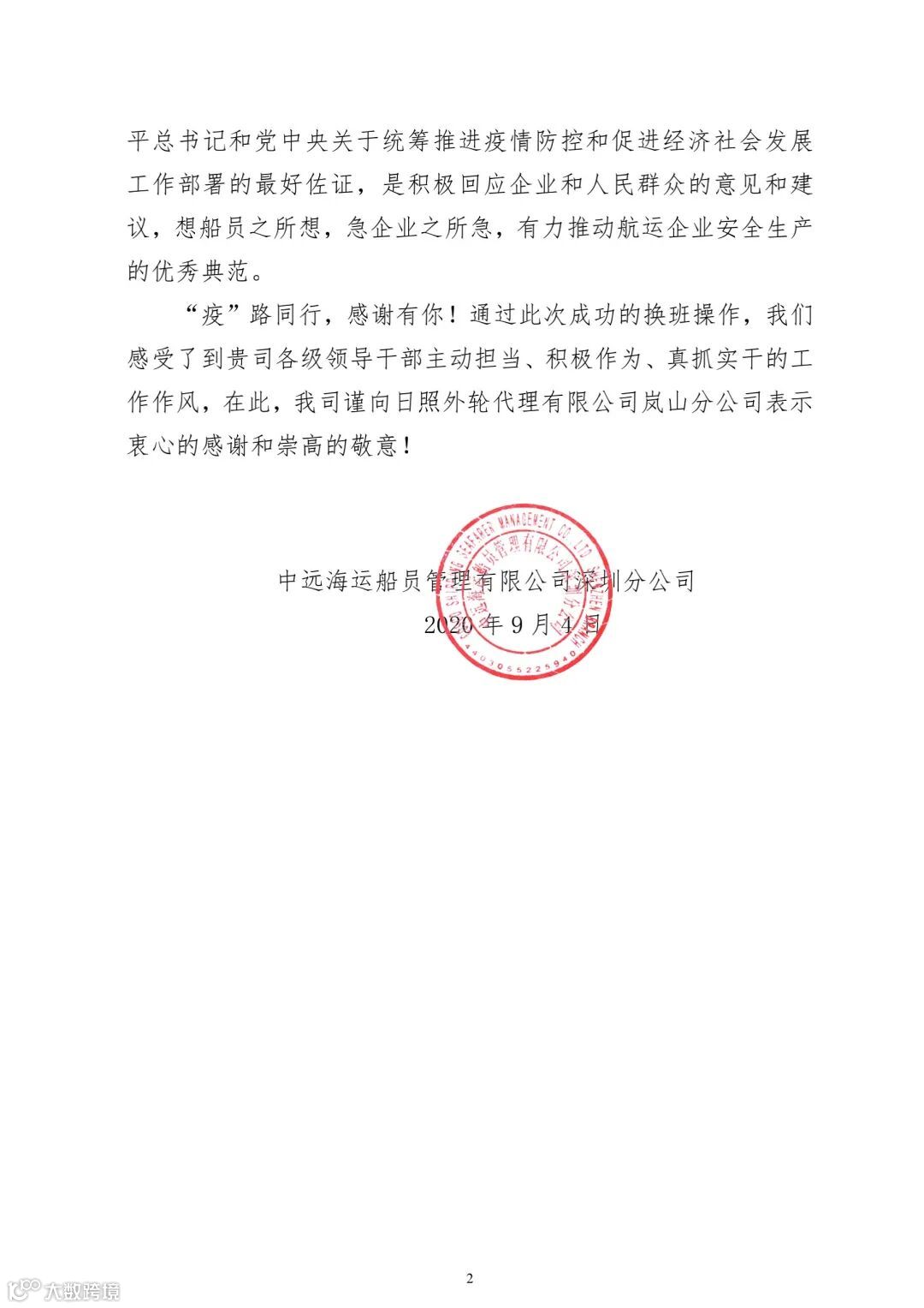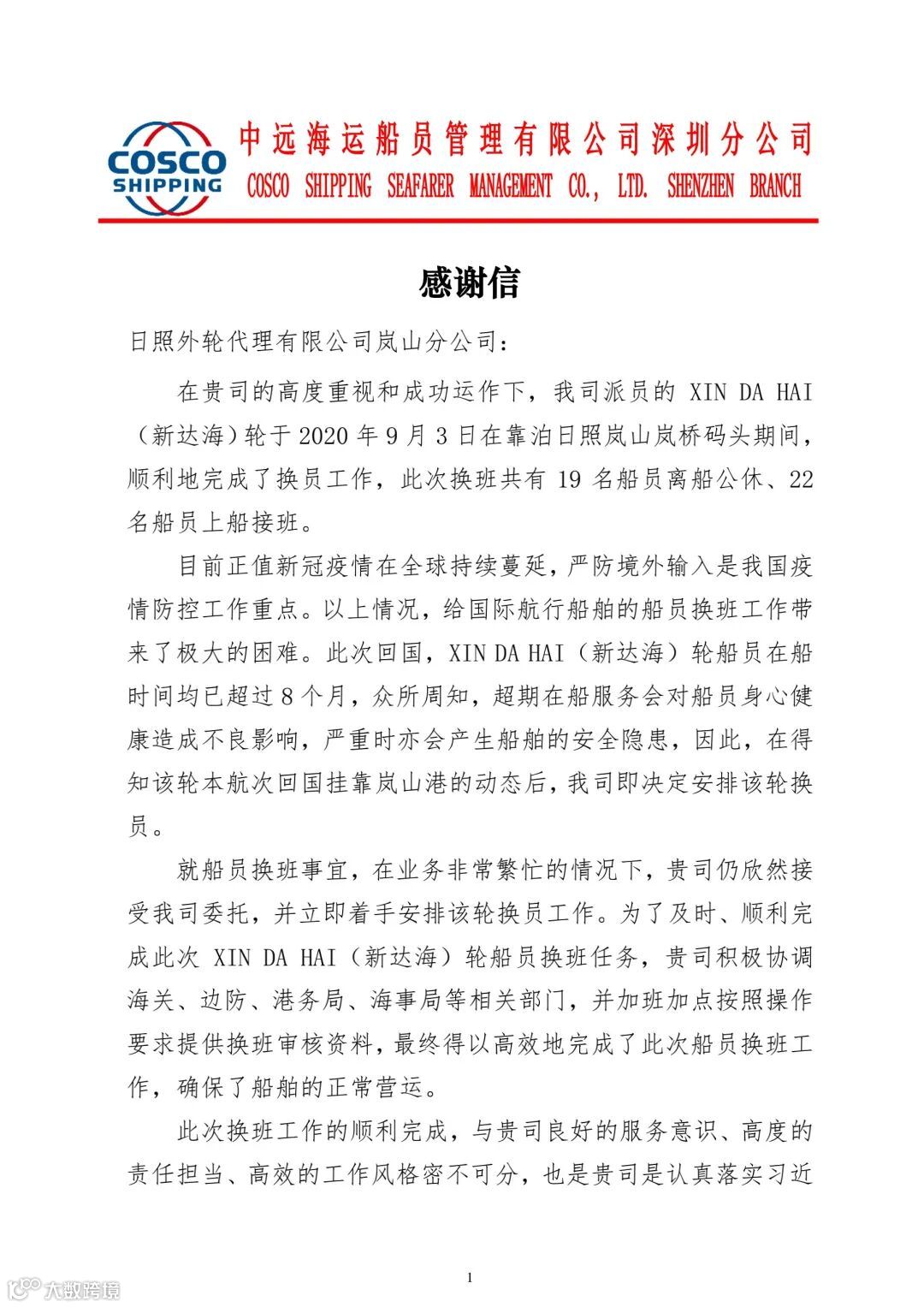 9月14日,日照外代收到中远海运船员管理有限公司深圳分公司的感谢信,信中对日照外代岚山分公司高度重视并成功运作“新达海”轮全体船员换班表示感谢。
