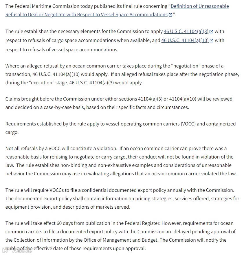 日前,美国联邦海事委员会(Federal Maritime Commission,FMC)对于船公司不合理拒绝订舱的事儿最终规则发布了。简单来说,分两种情况: