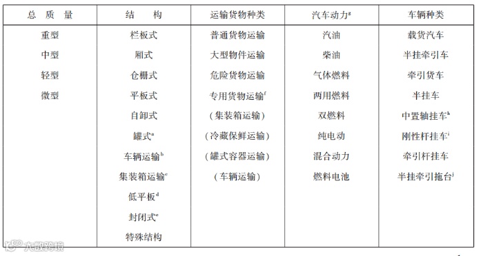 、结构、运输货物种类、汽车动力、车辆种类的原则和顺序进行划分,可选择其中一种至五种类别进行组合。