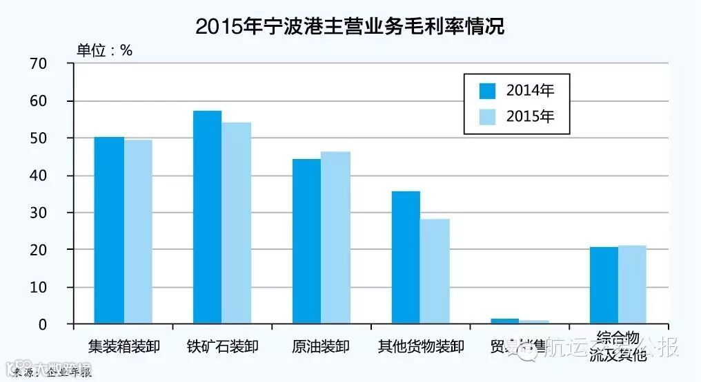 根据宁波港年报, 其营业收入增长主要来源于2014年8月成立的贸易企业的贸易业务增量,主业毛利润下降明显,致使各业务板块毛利率下降,利润增幅出现负增长。去年,宁波港实现营业收入165.2亿元,同比增长23.15%;实现归属于上市企业股东的净利润25.54亿元,同比下降9.39%;毛利率从2014年的31%降至25%。