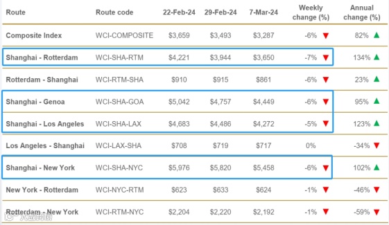 与此同时,周四德路里世界集装箱综合运价指数(WCI)也下跌了6%,欧洲航线更是重挫7%,这已经是连续六周的下跌趋势。尽管德路里预测未来几周即期运价将持续下滑,但预计不会出现剧烈崩盘。分析人士指出,尽管红海冲突信息不断,但与冲突密切相关的欧洲航线却领跌,这进一步凸显了市场供给过剩的现状。业内人士特别关注北美航线的运价走势。本周该航线跌幅有所收敛,显示出市场对需求减弱的反应可能已经接近尾声。尽管3月运价相较于2月跌幅有所回落,但仍维持在较高水平,预计3月下旬或4月初有望出现反弹。然而,由于先前的涨势过猛,市场普遍认为运价仍有下跌空间。美东航线下周有可能跌破5000美元大关,但船公司为了维护长约合约价格,也将努力保持运价在合理范围内。