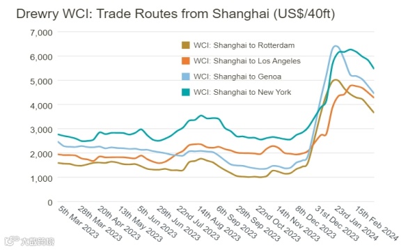 总的来看,节后复工状况不佳,市场对运价的稳定期待较往年有所延迟。往年此时运价已经趋于稳定,但现在看来可能需要等到3月下旬。船公司可能会通过减少航班和合并航班来稳定运价,特别是考虑到美线五月长约运价已经开始协商阶段。