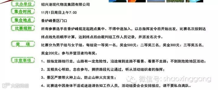 为了丰富绍兴港员工及入驻商户的文化生活,绍兴港秉承“服务为一,汇长共进”的服务理念,决定于本周日举办第三届香炉峰登山比赛。在前两届的举办过程中,大家踊跃参加,积极配合,比赛活动获得了大家的一致好评。今年,登山比赛又将拉开帷幕,具体事宜见下图: