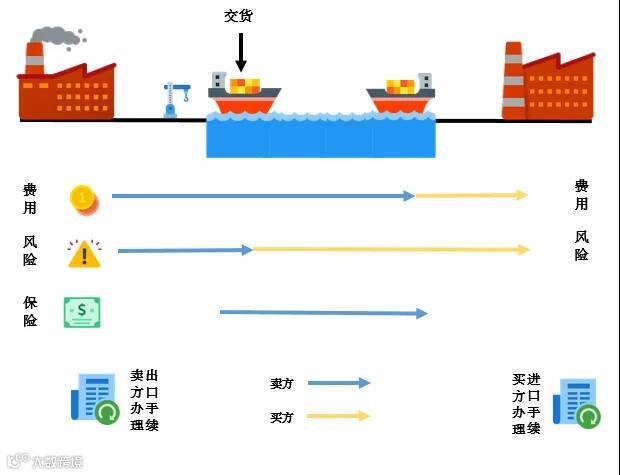 CIF和FOB术语中交货点及风险点都是在装运港的船上,卖方在装运港将货物安全地装到船上即完成卖方义务,装运后货物可能发生的风险,卖方不再承担责任。卖方将保险单、提单等交由买方,风险索赔等就由买方进行办理。