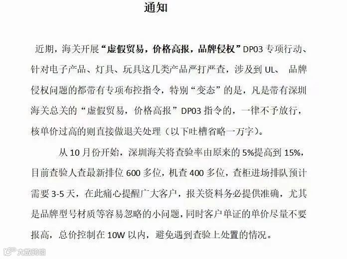 近日,有货代发通知表示,,海关正在开展“虚假贸易,价格高报,品牌侵权”DP03专项行动。针对电子产品、灯具、玩具这几类产品严打严查,涉及到UL、品牌侵权问题的都带有专项布控指令,特别“变态”的是,凡是带有深圳海关总关的“虚假贸易,价格高报”DP03指令的,律不予放行,核单价过高的则直接做退关处理。