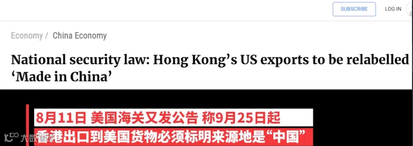 香港《南华早报》援引美国海关11日公告称,根据美国总统在7月14日签署的行政命令,由于美国认定“香港不再享有高度自治,因此不再保证继续享有与中国不同的特殊待遇”,因此由香港制造、出口到美国的货物将不再能贴“香港制造”标签,而必须标明来源地是“中国”。此举意味着,香港企业生产的产品将面临与中国内地出口商同样的贸易关税。