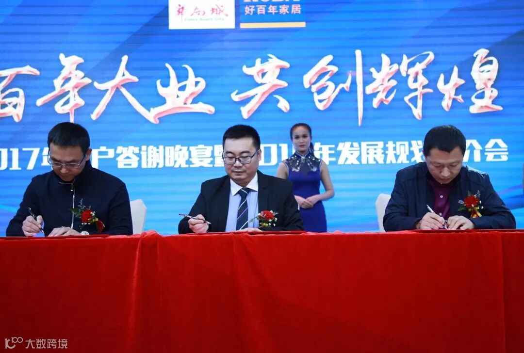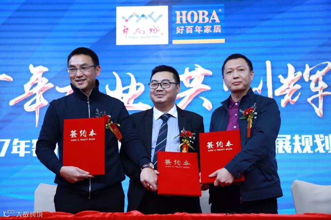 △(图中)好百年南宁项目总经理秦涛先生与(图左)广东联邦家私副总裁钟海舟、(图右)朴一家居总经理王军签署入驻协议