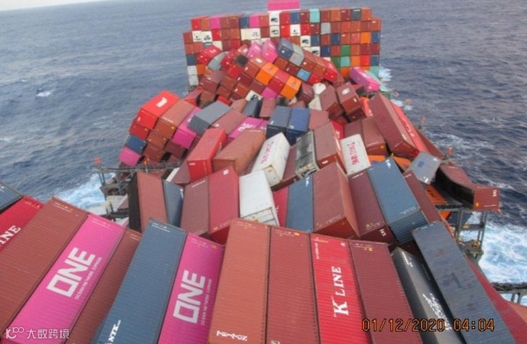 可以看到船上大量集装箱倒塌。