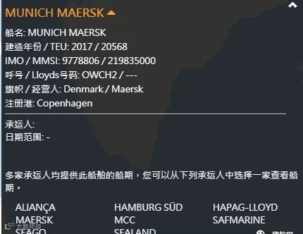 “MUNICH MAERSK”轮资料图资料显示,“MUNICH MAERSK”轮是马士基北欧线的主力船舶,服务于AE5航线,运力为20568TEU,事发前曾挂靠国内的大连、上海、宁波、盐田等港口,配载有该船的货主要注意是否有货损,船期是否有延误。