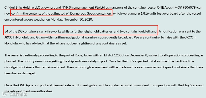 根据ONE最新公告显示,Chidori Ship Holding LLC作为集装箱船ONE Apus的所有者,而NYK Shipmanagement Pte Ltd作为船东,可以确认该船现已安全停泊在神户港。船期已严重延误。