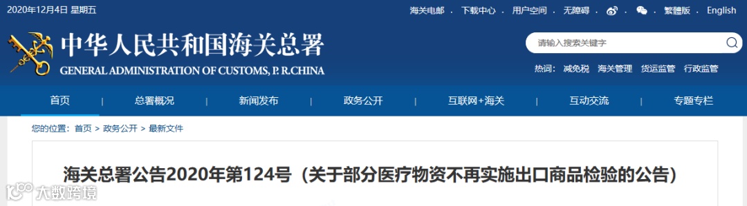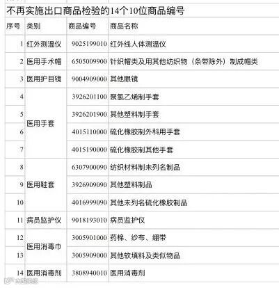 2020年12月3日,海关总署发布2020年第124号公告,即日起,对“9025199010”等14个10位商品编号项下的医疗物资(详见附件)不再实施出口商品检验。其中: