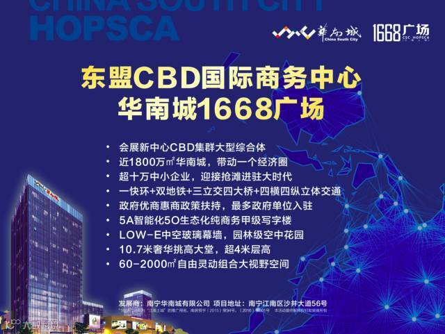南宁华南城CBD综合体——1668广场,集甲级写字楼、五星标准酒店、大型购物中心、星级院线、品牌超市于一体,建筑面积约21万平方米, 总投资超10亿元人民币。目前已经签约进驻了维也纳国际酒店、中影—嘉博影城、城盛百汇超市、北部湾银行、老百姓大药房等龙头品牌企业,丰富的业态组合使其成为档次高、业态全、配套完善的综合体项目。
