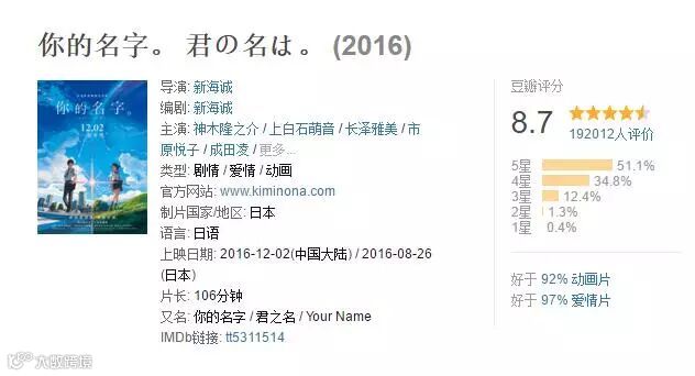 豆瓣评分也已达到了8.7分,好于92%的动画片。