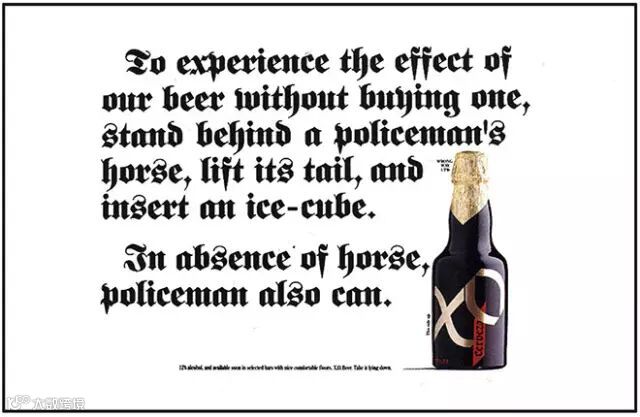 Neil french他们虚拟了一个啤酒品牌,并进行报纸广告宣传,事实上并不存在这样一个品牌!他们逆着所有现在成的啤酒广告规矩而行,最后这个品牌在当时取得了难以置信的成功,市场对这个虚拟的啤酒需求高的惊人,酒吧酒保因拿不出存货而惨遭攻击,这个案子成了经典传奇,下面我们一起来目睹这个传奇啤酒品牌是如何通过一系列平面海报诞生的。