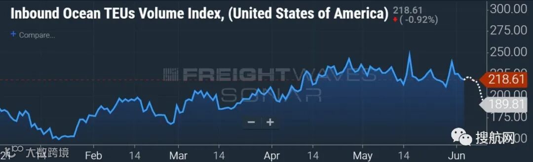 北美货运市场的SaaS数据提供商FreightWaves,其平台上的托运人专有海运预订指数显示,在整个5月攀升之后,该指数目前已陷入停滞,至少在6月初出现了短暂下跌,其中包括未来一周的预订量数据。