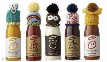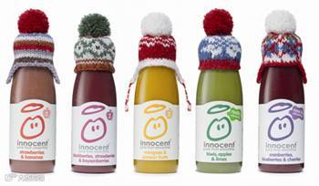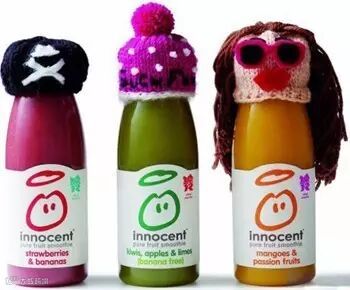 每年秋冬季,Innocent果汁的小瓶装都会戴上小毛线帽。仔细看来每个都不一样,找不到两个完全相似的。