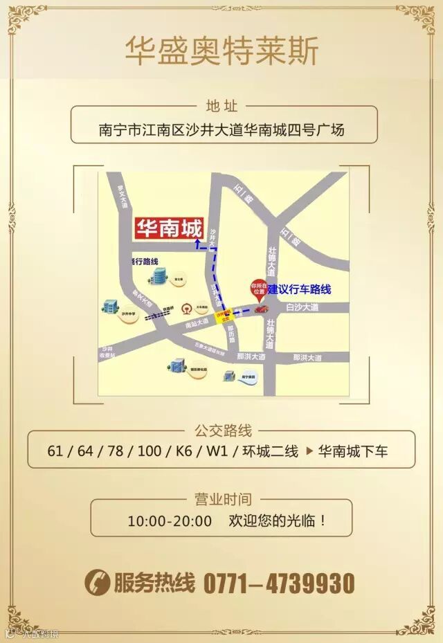 地址:南宁华南城4号馆·华盛奥莱1F 时尚馆