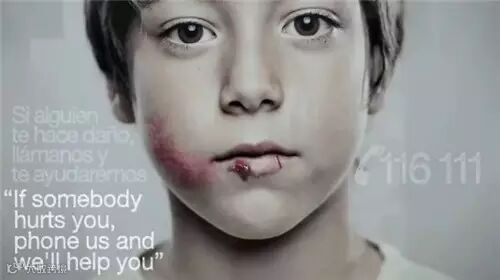 但是如果是孩子,从他的角度就能看到完全不同的另一个画面:小男孩子的脸上有严重的淤青,海报上非常突出一句话:“如果有人伤害你,请给我们打电话,我们会帮助你”