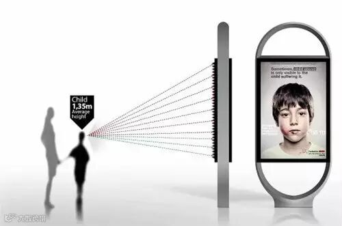 这不是夸张也不是魔术,而是通过精心的设计才能达到的效果。这则户外广告通过镜子不同的透镜层,能够从不同的角度看到不一样的图像。这也就是为什么只有孩子能看见画面中小男孩的伤痕和求助的方式。