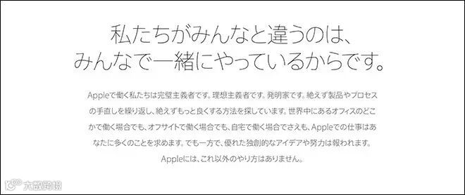 乍一看前后两个半句有点自相矛盾,让人不甚明朗,而这也是苹果一贯的风格。Apple 有着他人无法企及的独特存在感,所以「与众不同」。这个企业的存在感,是所有员工努力的结果,所以说「因为总是工作在一起」。